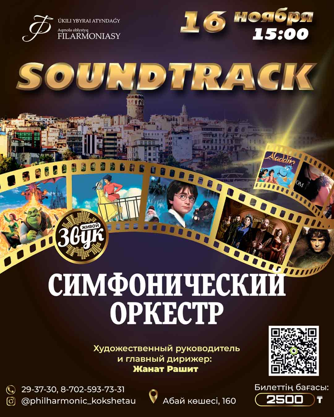 November 16, 3:00 PM The Symphony Orchestra will present to the audience the concert “Soundtrack.” Artistic Director and Chief Conductor — Zhanat Rashit. The concert program will feature soundtracks from legendary and world-famous films. Immerse yourself in the enchanting atmosphere of your favorite movies and enjoy the stirring melodies and songs performed by the symphony orchestra! Music from “Game of Thrones,” “Pirates of the Caribbean,” “The Lord of the Rings,” “Çalıkuşu” (“The Wren”), “Magnificent Century,” “Aladdin,” “Love for Rent,”* and many others will surely find a special place in the hearts of listeners.